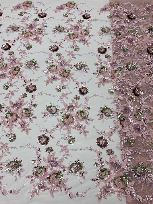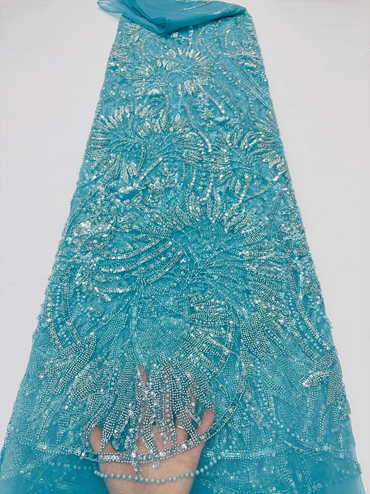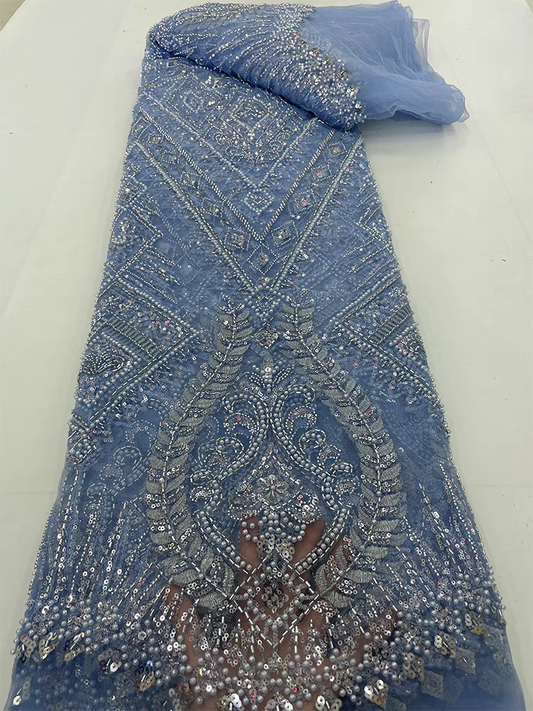 Light blue mesh fabric heavy bead tube embroidery beaded flower pattern multi-color sequins embroidery fabric wedding dress
