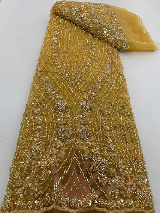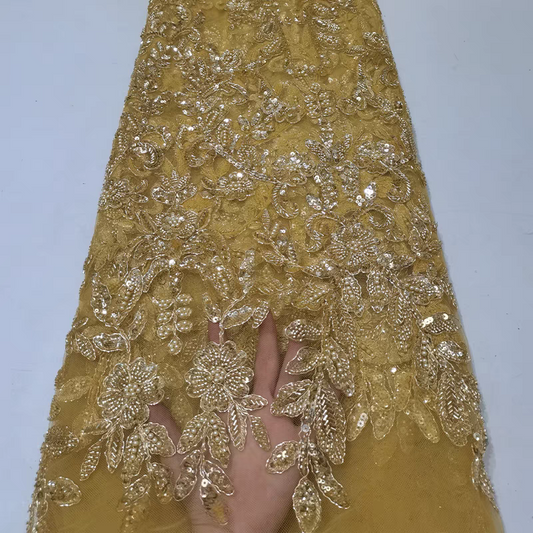 Beaded tube embroidery pearl lace mesh fabric gold tassel sequin embroidery fabric dress clothing Five yards