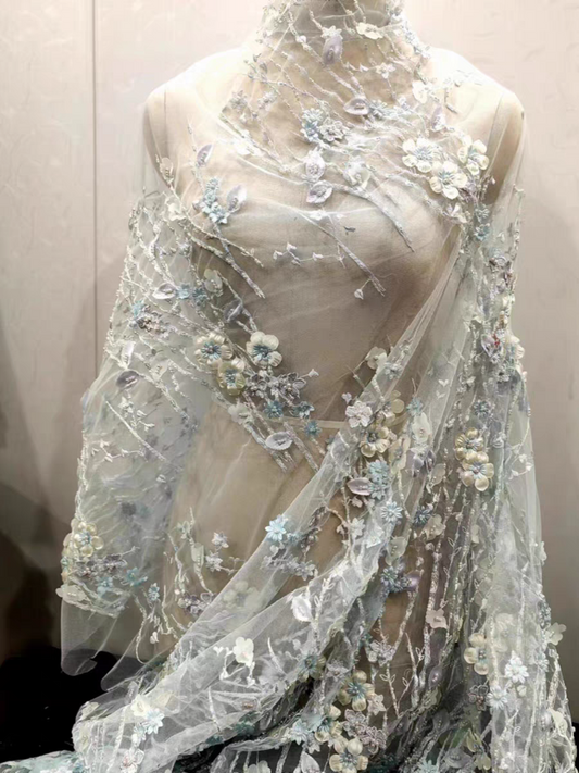 Blue mesh heavy industry bead tube embroidery beading three-dimensional flower pattern sequin embroidery fabric dress wedding dress