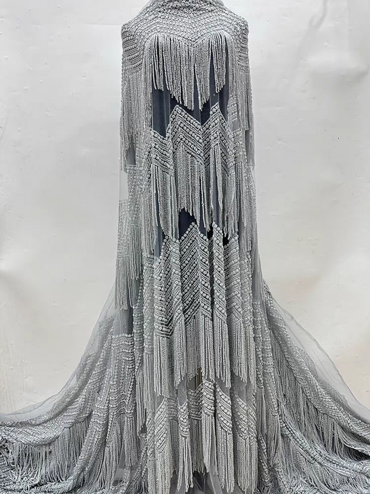 New high quality heavy industry fully beaded fish scale wavy lace fabric wedding gauze mesh dress custom decoration