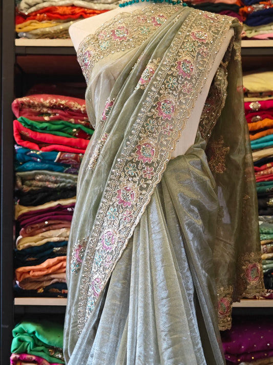 Hand-Embroidered Beaded Orange Saree | Amehandmadesg