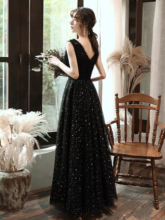 Evening Gowns Sexy V-neck Backless Black Train Robe De Soiree Formal Sleeveless A-Line Women Party Dresses E874