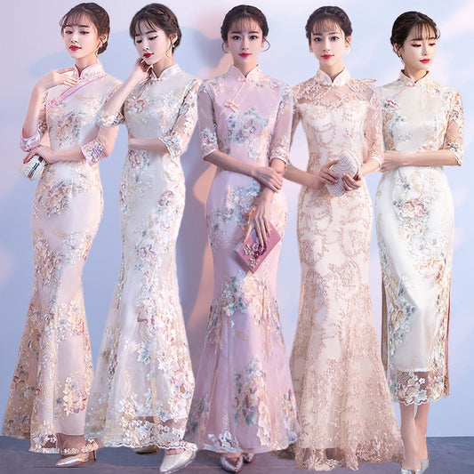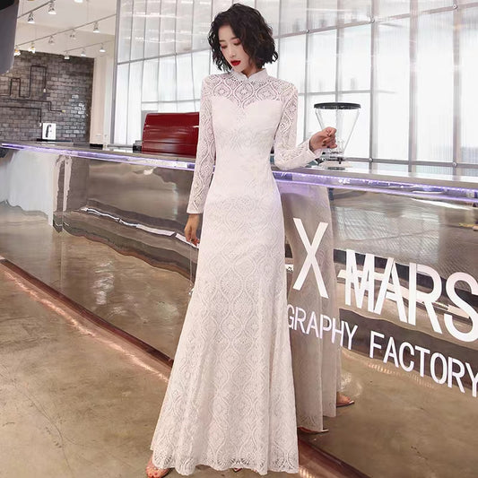 French cheongsam young improved girl dress women's white long fishtail banquet retro elegant Chinese wind