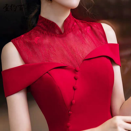 Bride wedding dress toast service 2020 new red Chinese stand-up collar slim fishtail wedding back door evening dress