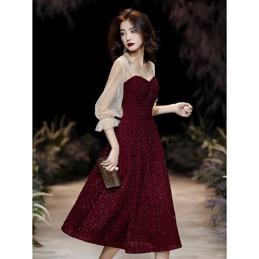 Banquet evening dress red long-sleeved dress women evening dress birthday party dress