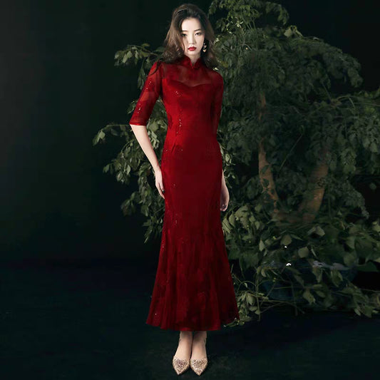 Toasted bride cheongsam 2020 new wine red fishtail retro Chinese wind back door casual wedding dress