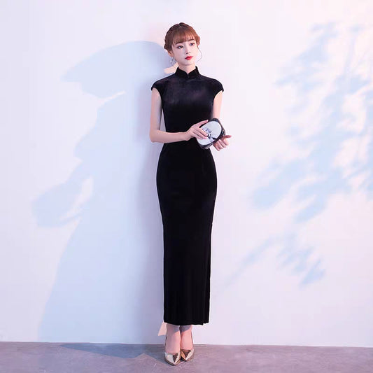 Gold velvet modified version cheongsam 2019 autumn young girl temperament elegant long Chinese style banquet dress
