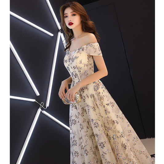 Evening Dress Short Sleeve Backless A-Line Robe De Soiree Sequin Off Shoulder Floor-Length Women Party Dresses E1119