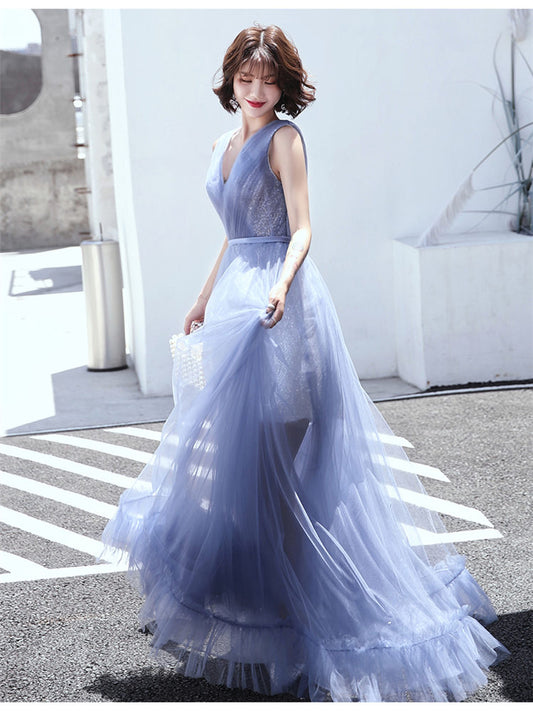 Evening Gowns Elegant Tiered V-neck Blue A-Line Robe De Soiree Sleeveles Floor-Length Women Party Dresses E861