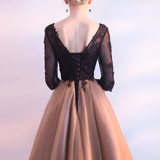 Luxury Black And Yellow O-Neck Half Sleeve Backless Appliques Lace Up Cocktail Dresses Knee Length Formal Dress LX458