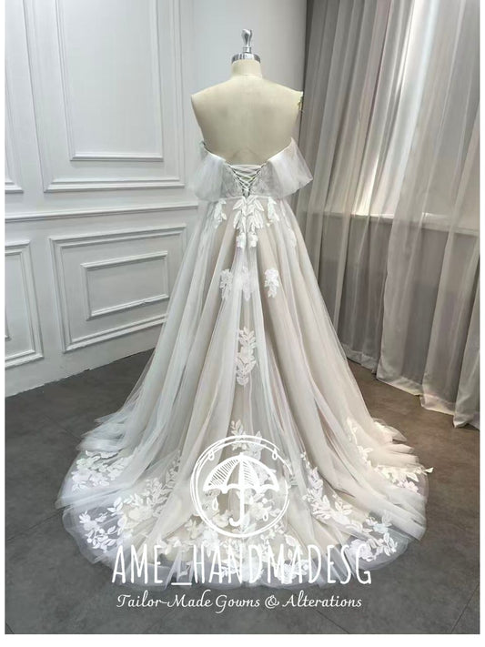 Ethereal Off-Shoulder Tulle Wedding Gown with Floral Lace Appliqué & Flowing Train