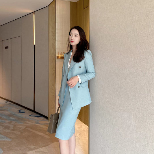 Elegant Celadon Spring Pleated Skirt Suit – Fitted Hip‑Accented