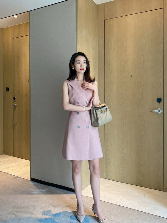 • Summer Fuchsia Sleeveless Double-Breasted Suit Jacket with A-Line Skirt