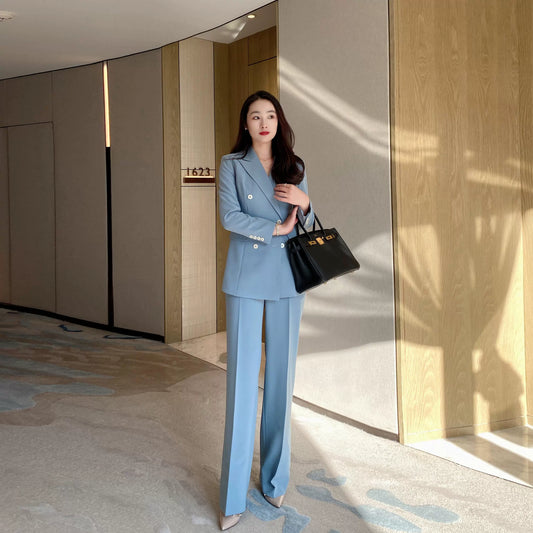 Lake Blue Women's Double‑Breasted Suit Set with Loose Straight Trousers