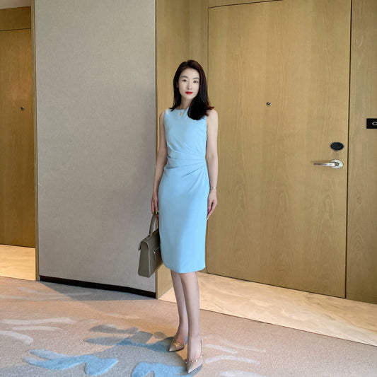 Summer Blue Elegant Sleeveless Dress High-Waist Mid-Length Skirt