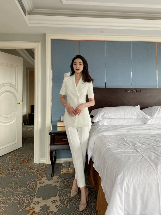 Elegant White Pearl Polyester Summer Suit Jacket with Short Sleeve