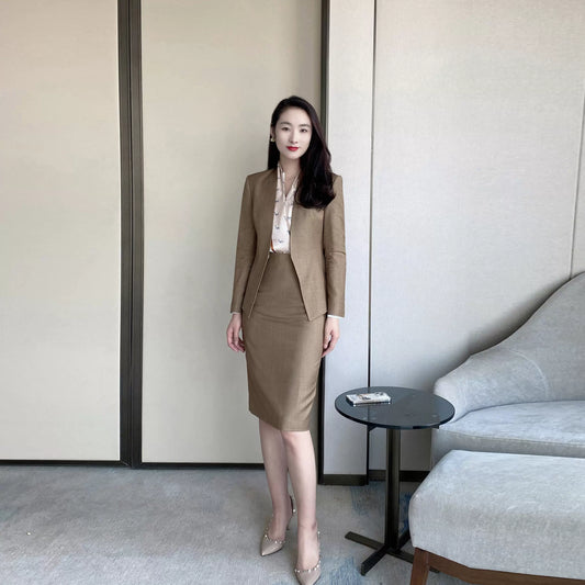 Elegant Autumn Coffee-Colored Classic Women's Suit with Fitted Skirt