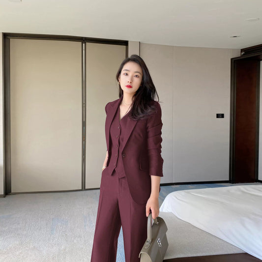Red One-Button Wool Suit Elegant Wide-Leg Trousers for Women