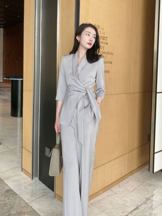 Summer Soft Fitted Suit with Brace and Loose Straight Trousers