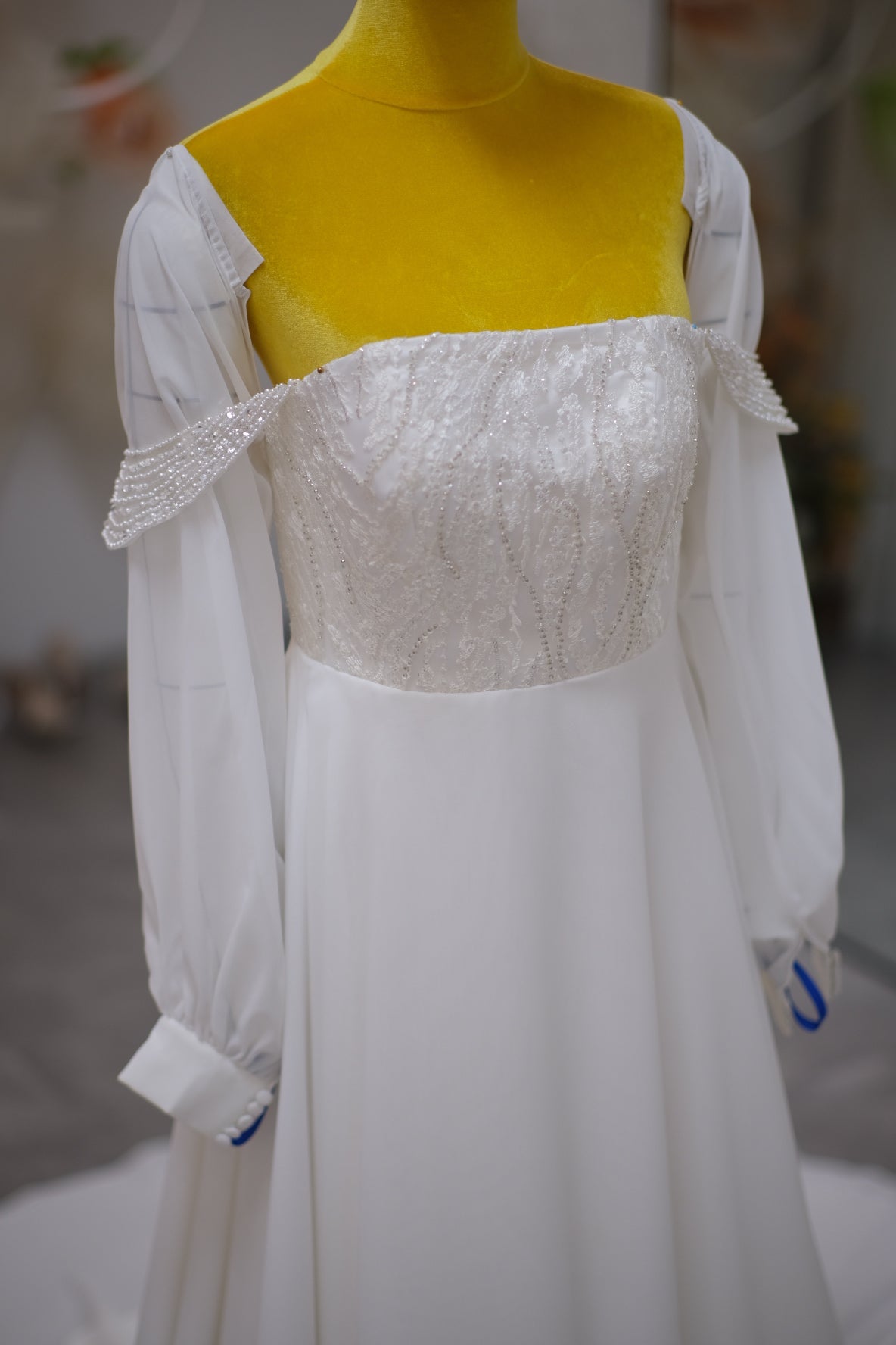 A bespoke creation from our signature collection, this gown is designed to reflect timeless elegance and personal expression. Crafted with precision and care, it features premium fabrics, refined details, and a silhouette tailored to flatter. Ideal for brides seeking sophistication with a touch of individuality, each piece is made-to-measure in our studio to ensure an unforgettable fit and finish.