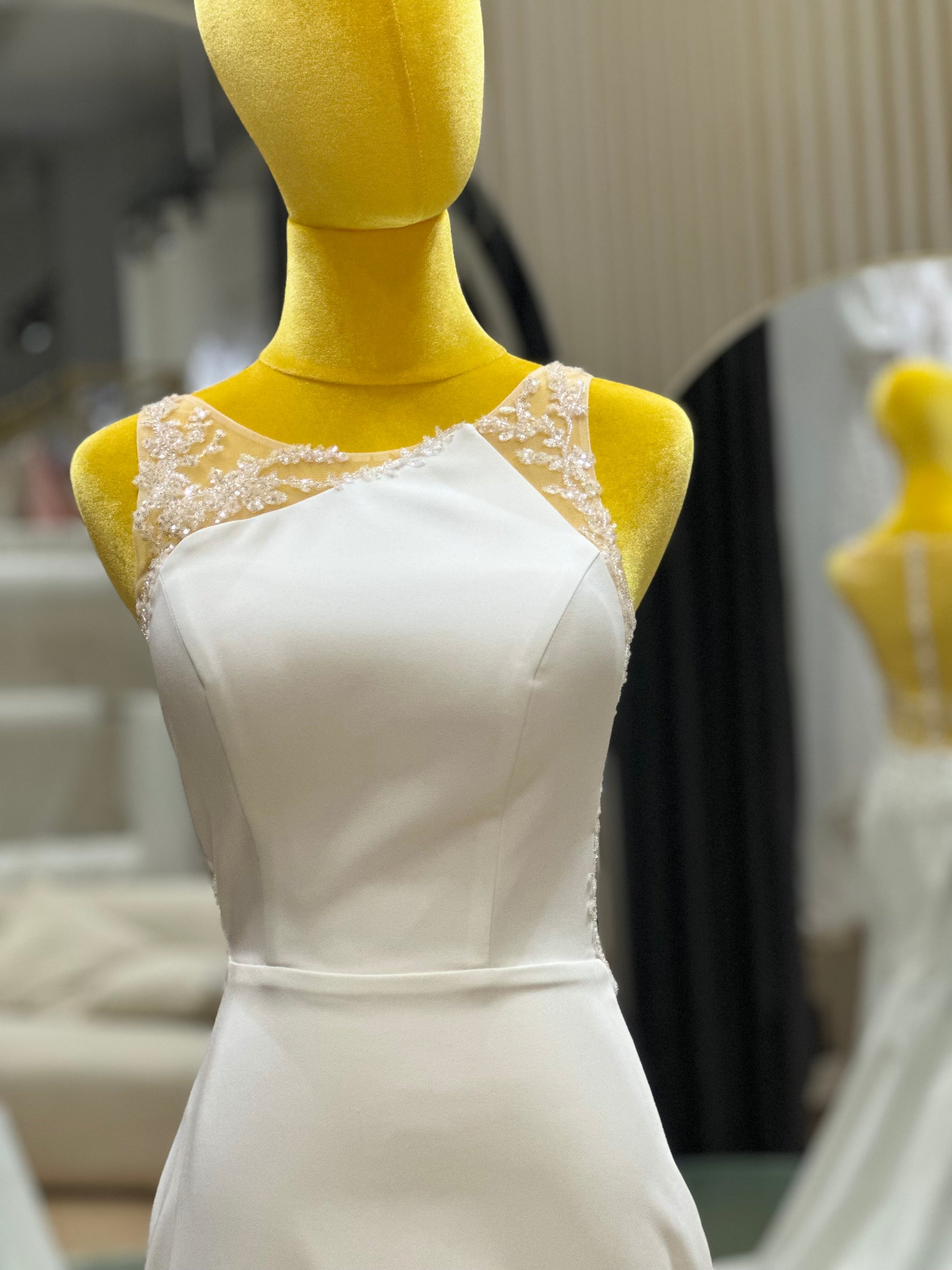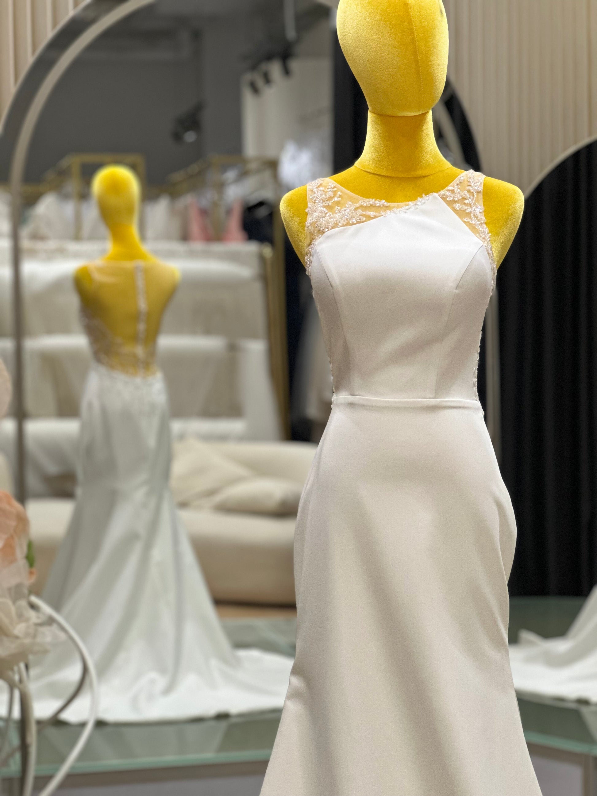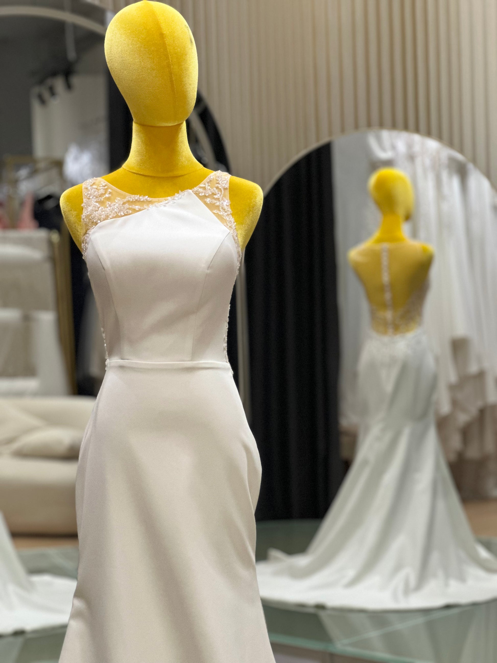 A bespoke creation from our signature collection, this gown is designed to reflect timeless elegance and personal expression. Crafted with precision and care, it features premium fabrics, refined details, and a silhouette tailored to flatter. Ideal for brides seeking sophistication with a touch of individuality, each piece is made-to-measure in our studio to ensure an unforgettable fit and finish.