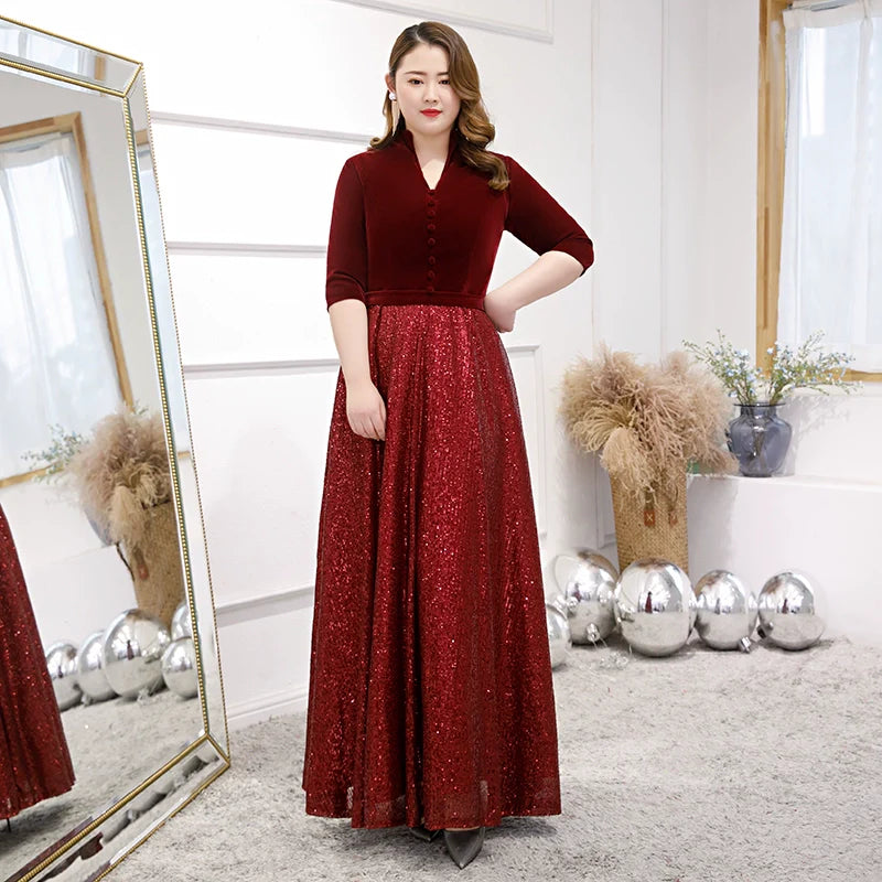 Elegance embodied, this Burgundy Velvet Evening Dress is perfect for any formal occasion. Made from luxurious velvet, it features a fitted bodice, A-line skirt, and a stunning V-neckline. The dress is available in various sizes, including 3XL, 4XL, 5XL, 6XL, and 7XL, to cater to different body types. With its sophisticated design and exquisite details, this dress is sure to turn heads at any event. Whether you're attending a wedding, a party, or a formal gala, this dress is sure to make you feel like a queen. The velvet fabric drapes elegantly on the body, creating a flattering silhouette. Pair it with some statement accessories and you're ready to make a lasting impression. The dress is not only beautiful but also well-made, with attention to detail and a focus on quality. It's a must-have for anyone looking to elevate their formal wear wardrobe.