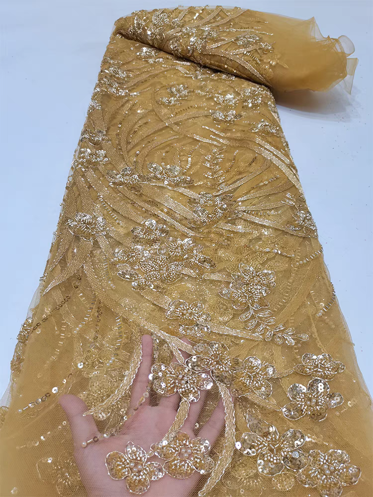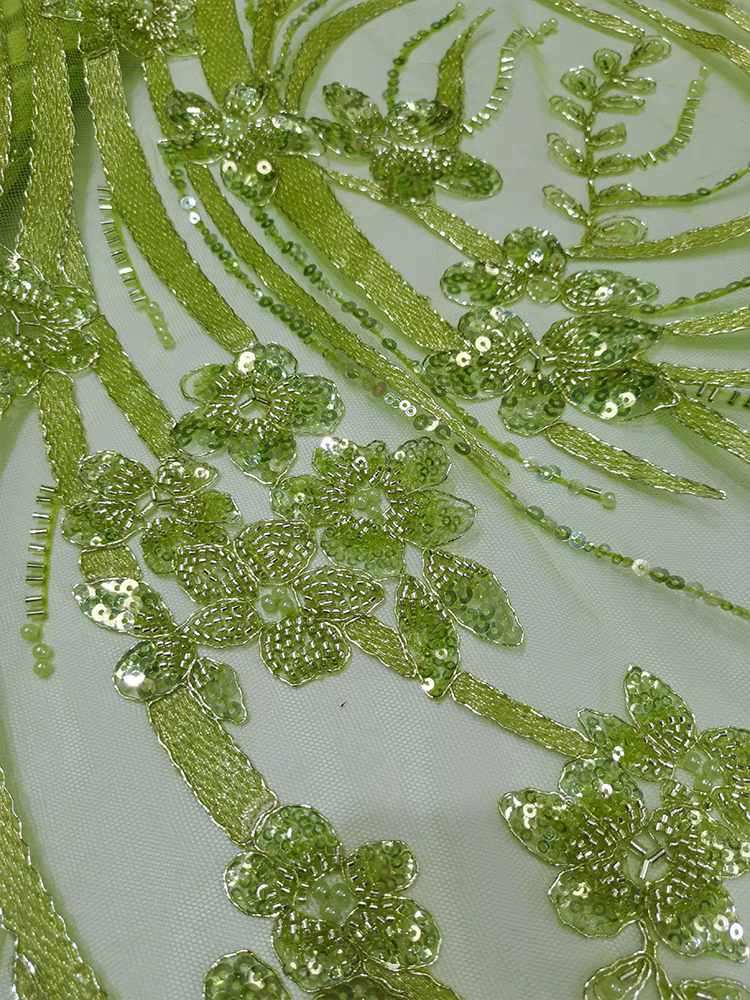 European and American green mesh fabric bead tube embroidery beaded three-dimensional flower pattern sequin embroidery fabric dress clothing wedding dress 5y
