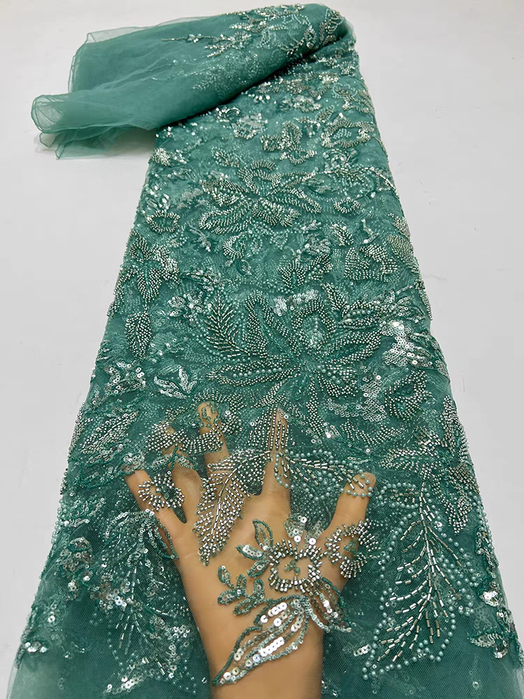 European and American green mesh fabric heavy industry bead tube embroidery beading floral pattern bubble bead sequin embroidery fabric dress wedding dress