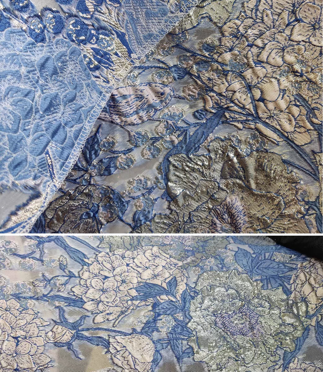 FAB-BROC-018 Summer European style flower and bird embossed gold silk organza cut flower fabric tube top dress headscarf hairband jacquard fabric thin and transparent