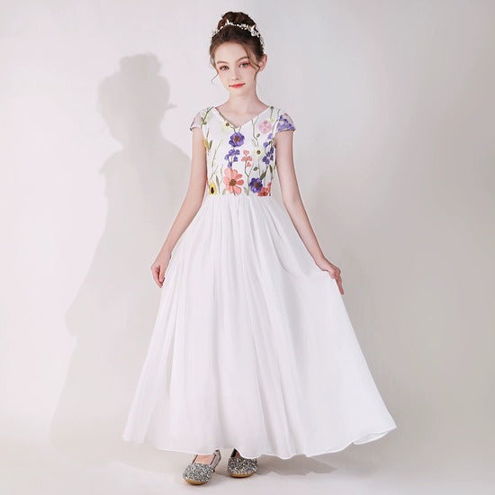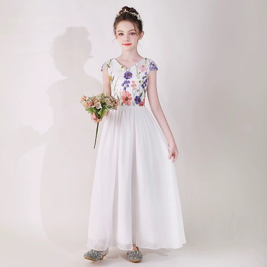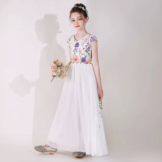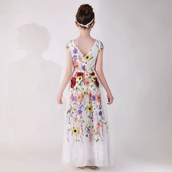 This flowered princess dress is perfect for any occasion, featuring a beautiful floral design and a comfortable fit. Made from high-quality shiffon material, it is sure to make your little one feel like royalty. The dress is available in various sizes and is suitable for girls aged 5-14 years. With its elegant design and comfortable wear, this dress is a must-have for any young princess. The dress is made from 100% polyester fiber and has a conventional thickness. It is a long dress with a V-neckline and short sleeves, making it perfect for formal events or everyday wear. The dress is also available in different colors, including ivory.