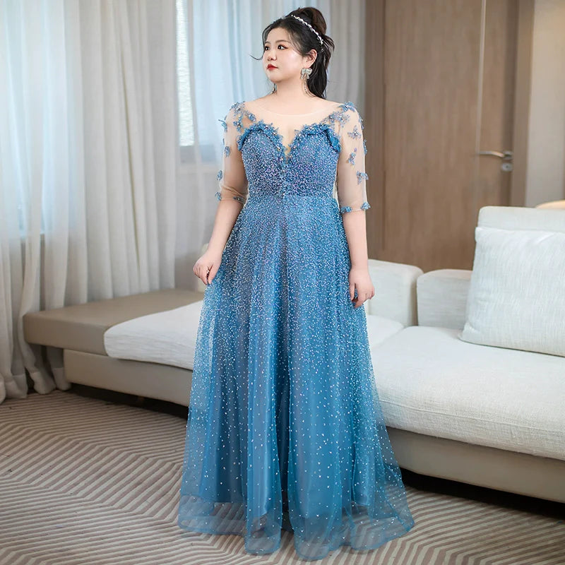 This elegant gray-blue evening dress is perfect for various occasions such as weddings, adult ceremonies, and performances. The dress features a round neck, long sleeves, and an A-line skirt, making it a classic and timeless choice. Made from polyester, the dress is comfortable to wear and easy to care for. With its beautiful color and elegant design, this dress is sure to make you stand out in any crowd. The dress is available in different sizes, including 3XL, 4XL, 5XL, and 6XL, ensuring a perfect fit for everyone.