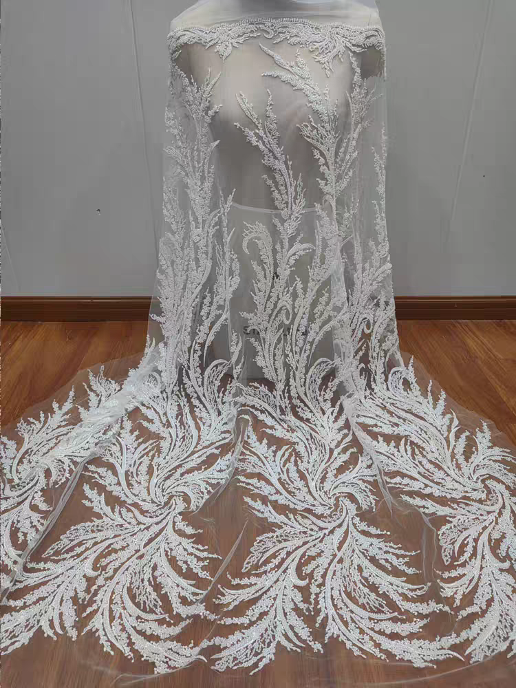 High-quality heavy-duty embroidery white beaded lace mesh fabric wedding dress women's dress DIY lace clothing accessories