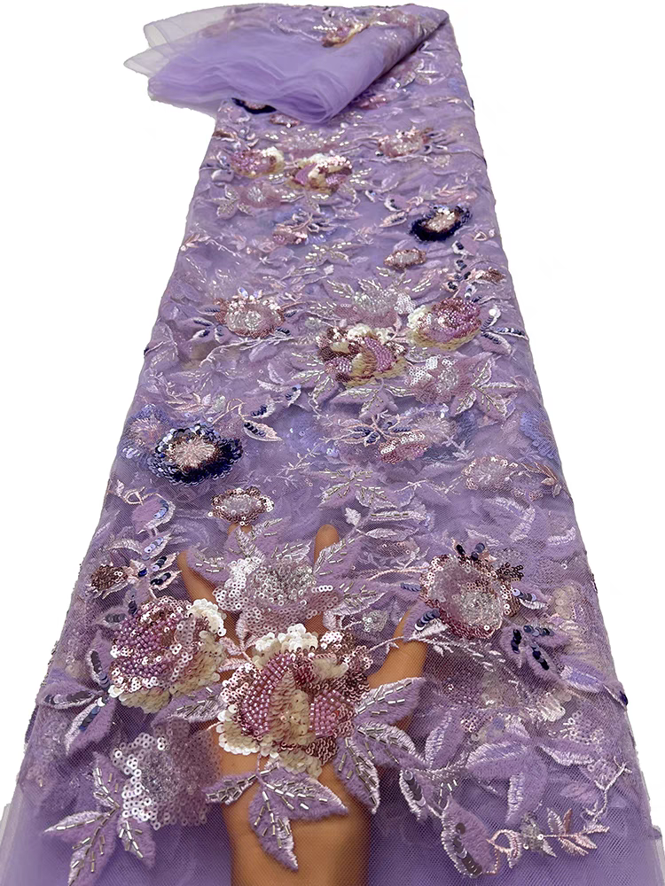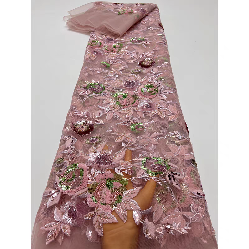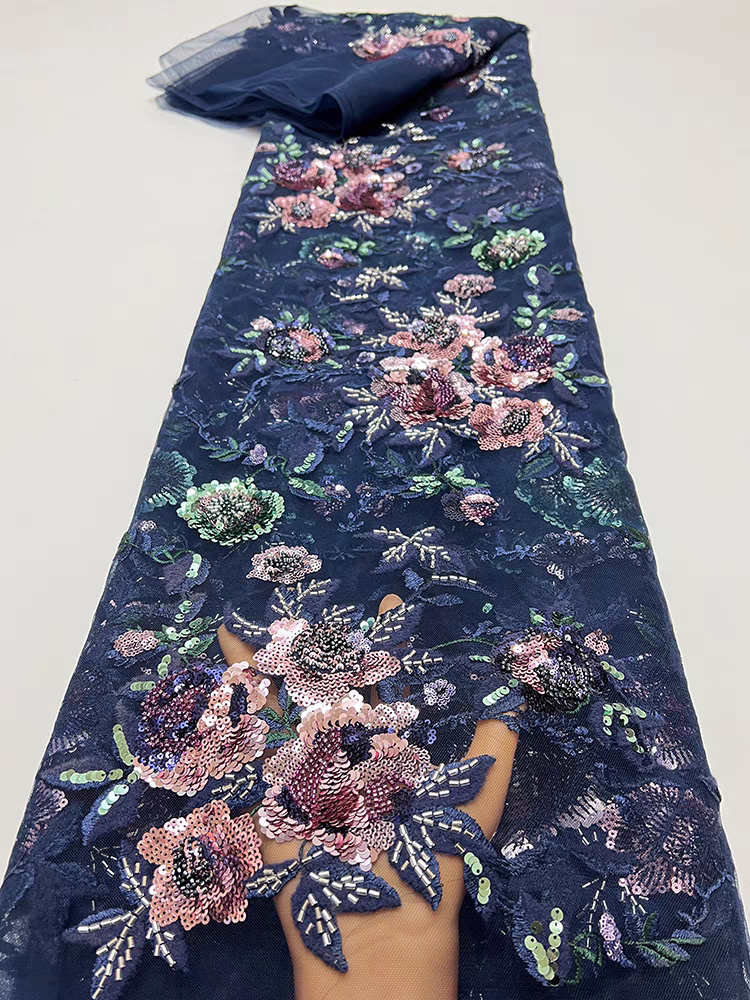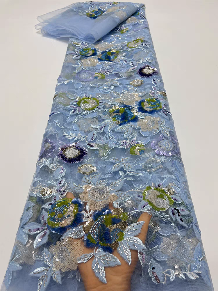 Light blue mesh fabric heavy bead tube embroidery beaded flower pattern multi-color sequins embroidery fabric wedding dress