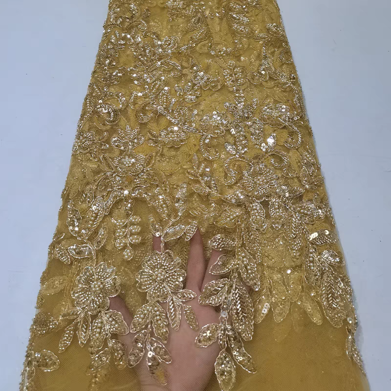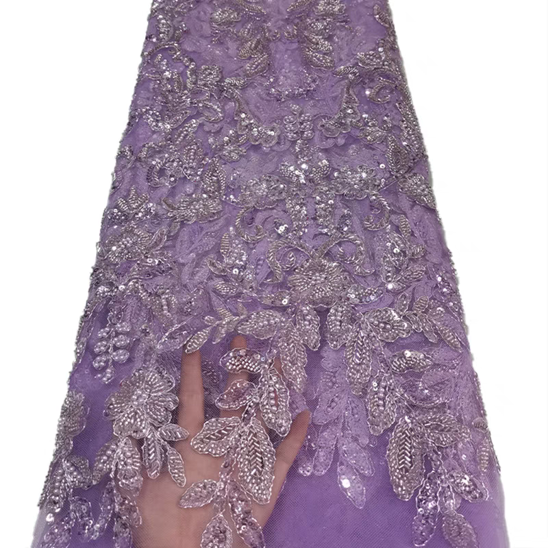 Purple lace mesh fabric heavy leaf flower pattern beaded pearl sequin embroidery fabric dress wedding dress fabric