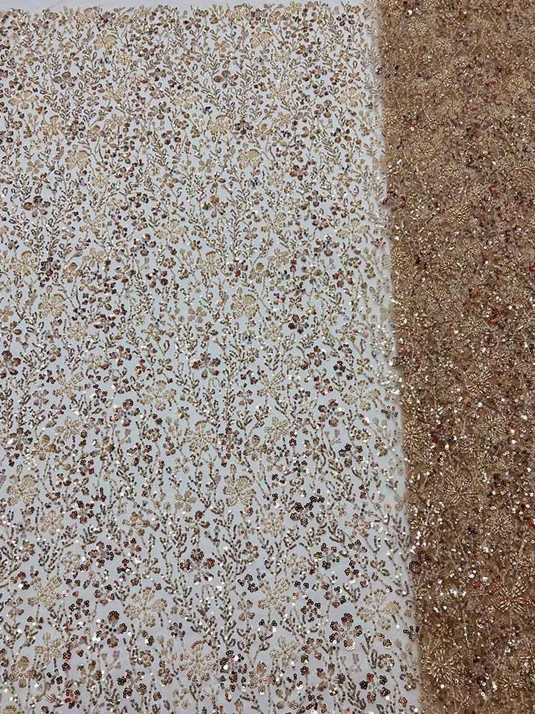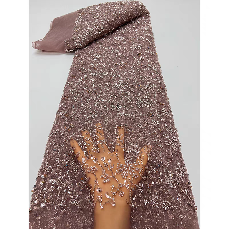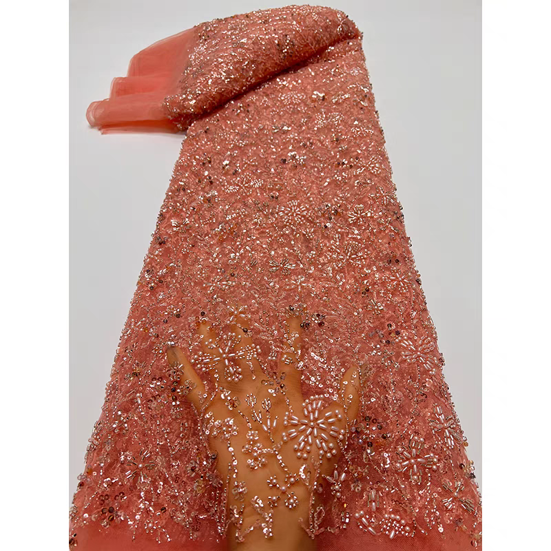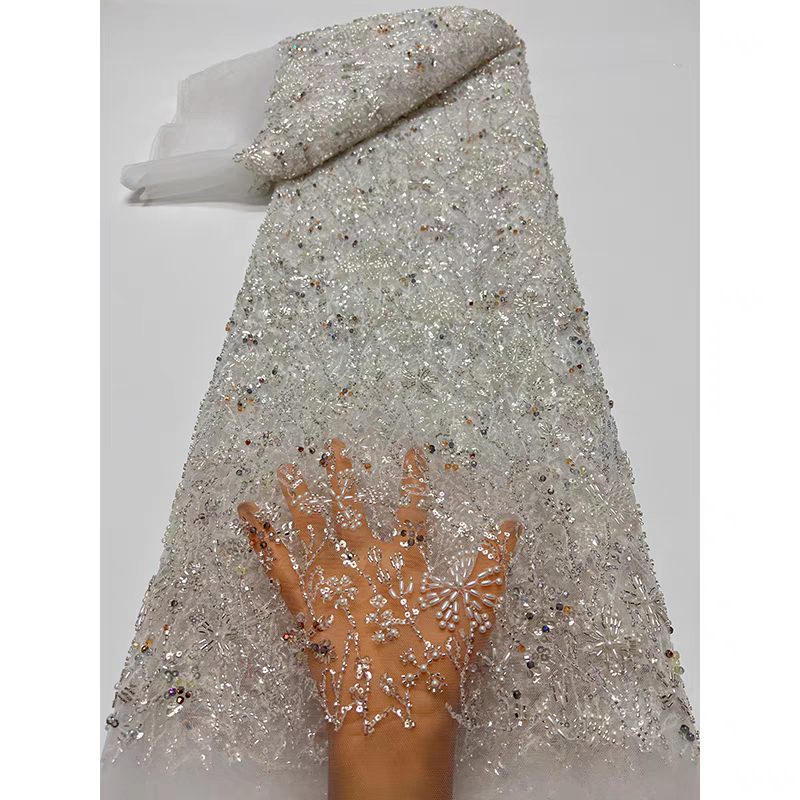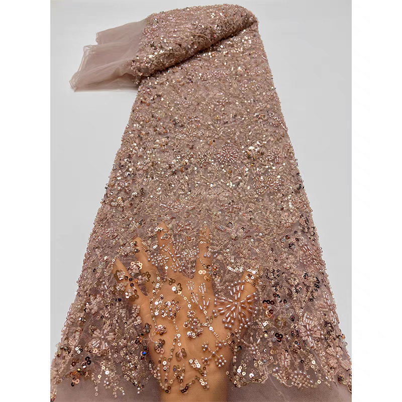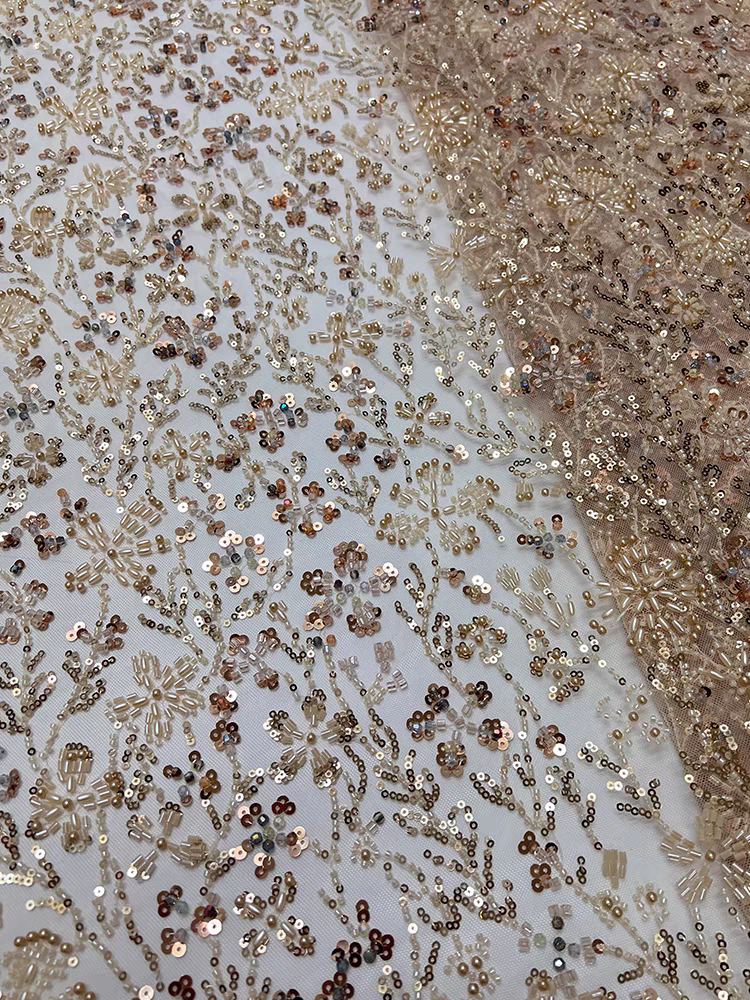 Ready-made mesh fabric, beaded tube embroidery, five-bead three-dimensional flower pattern, sequins, embroidered fabric, dress, wedding dress